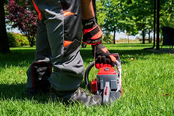 When using a chainsaw, wear all the essential anti-cut clothing, including gloves, jacket, trousers (or dungarees or leggings) and chain-proof forestry or trekking boots. Your head, face and eyes must also be protected—with a helmet, goggles or visor—from blows, falling branches, splinters of wood and so on. Your hearing must equally be safeguarded from engine noise (particularly when using petrol-powered chainsaws) by wearing noise filtering ear defenders, including with integrated helmet.
