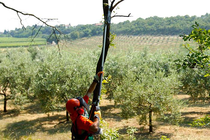 Compared with manual equipment, whether telescopic or not, with a pruning chainsaw you have all the advantages of motorised power: you can cut through everything—including the thickest branches and the hardest wood—faster and with less effort, even if you have lots of branches and trees to prune, such as on an orchard. Irrespective of the power source (petrol, battery or electric), with a pruning chainsaw you can work up close to the plants, with greater control in terms of movement and cutting precision, unlike with a telescopic pruner.